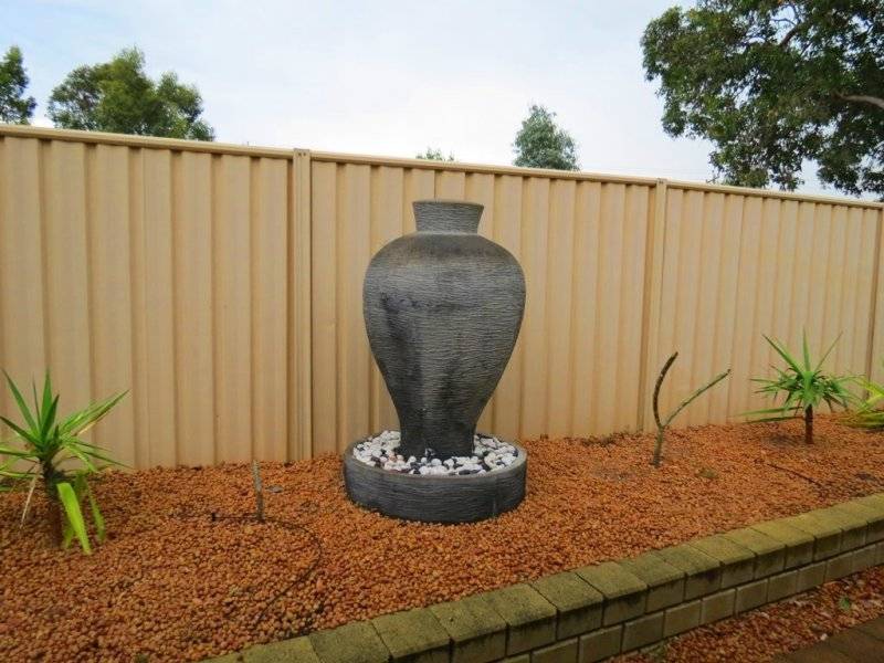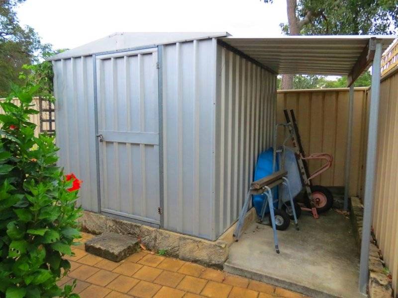 The entertainment area includes a wrap around pergola and feature Urn surrounded by easy care garden beds and there is a garden shed wit lean to for extra storage.