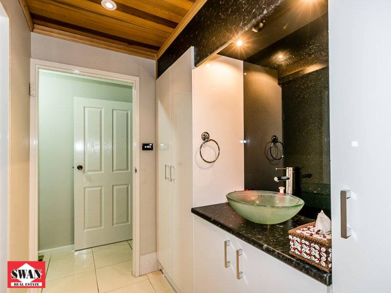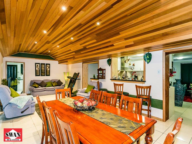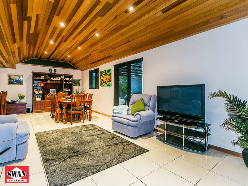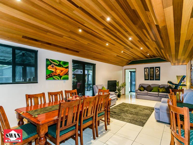 With a Balinese inspired feel, all your creature comforts will be taken care of. As you step through the front door you are welcomed into the lounge room which opens out the kitchen and large family room. All living areas feature tiled floors. The kitchen is well equipped and has a 6 burner stainless steel cooker, dishwasher, granite bench tops and plenty of cupboard space. The large family room has a timber lined ceiling creating a cosy environment.