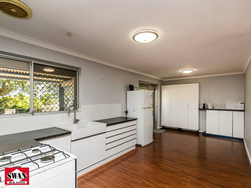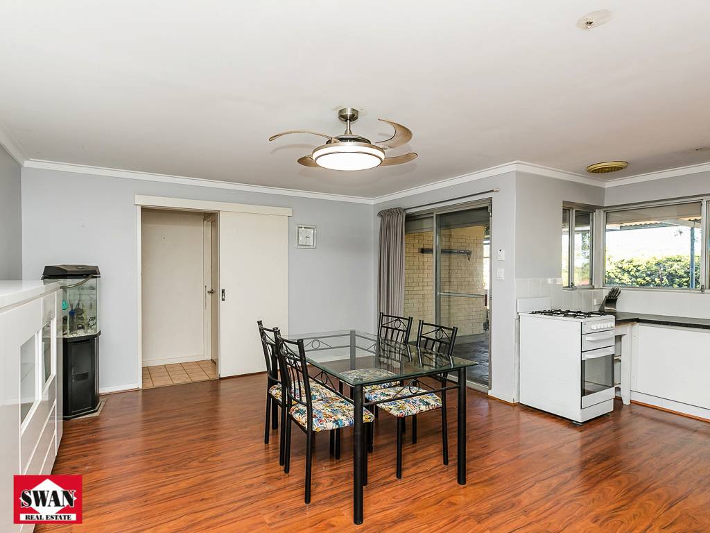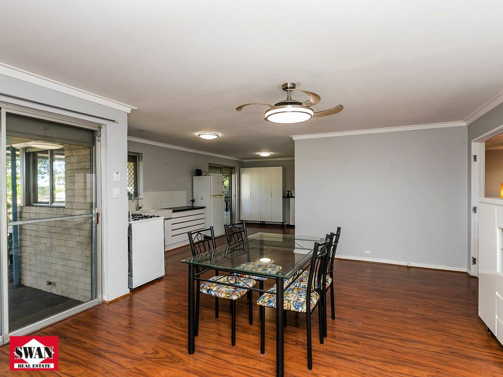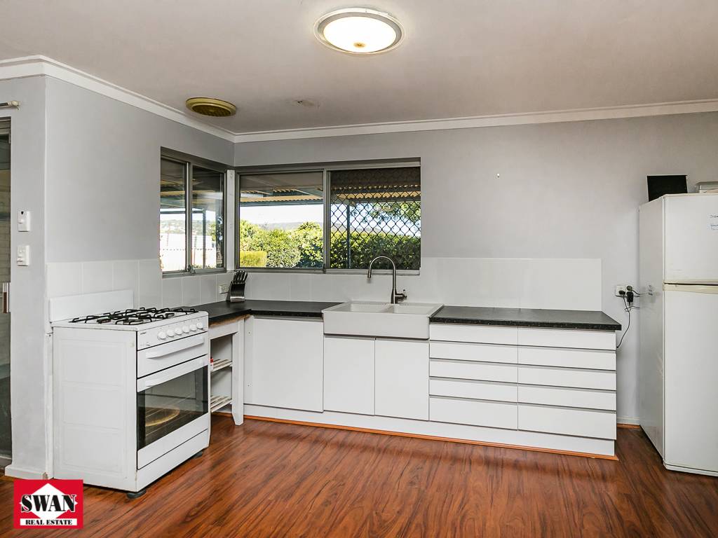 On entry, there is a good size sunken living room with split system air-conditioning and ceiling fan. This leads onto the modernised open plan kitchen and dining area featuring neutral colours, butlers sink and plenty of room for additional storage.