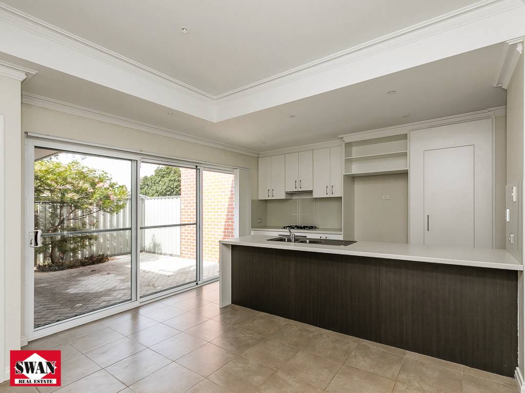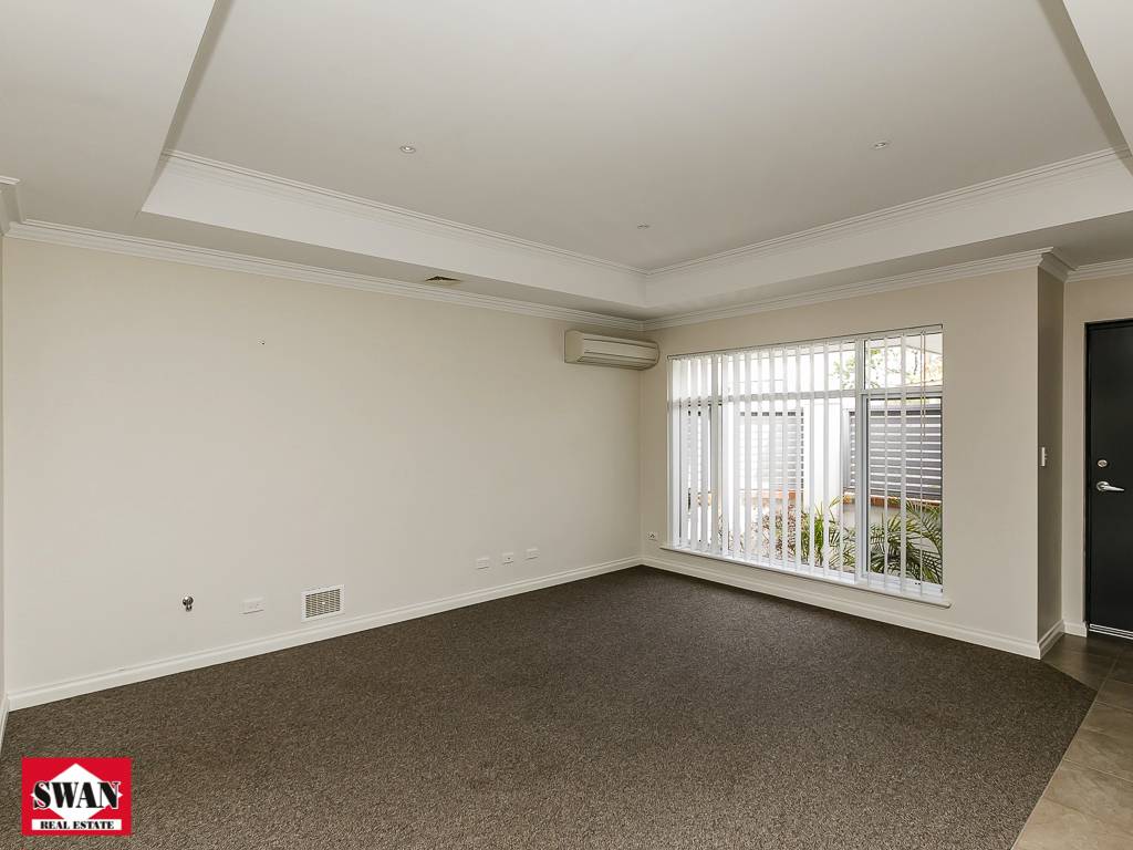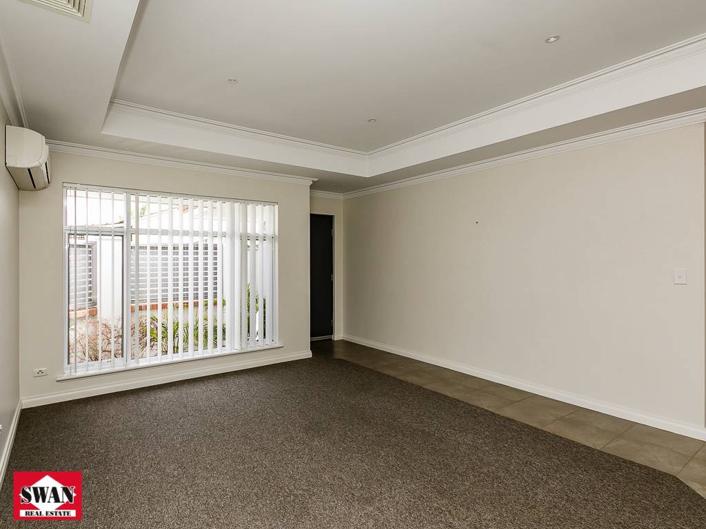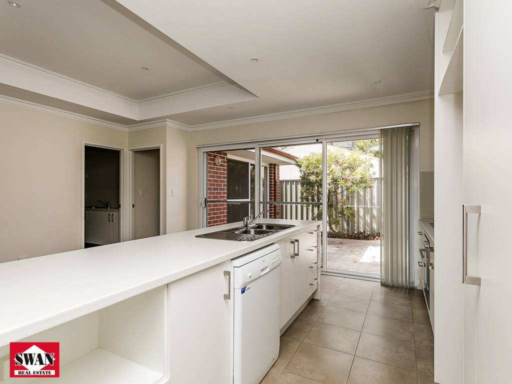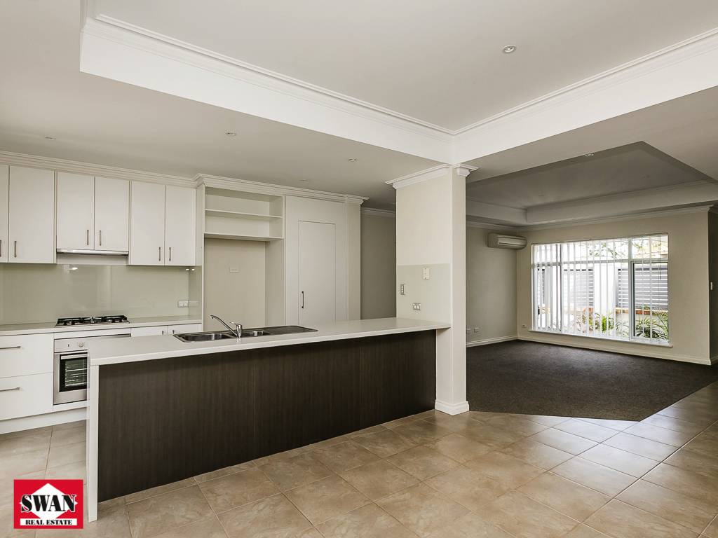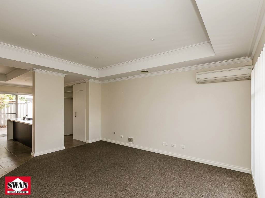 The kitchen is spacious and very modern, looking out over the dining room and lounge room which has a split system air conditioner.