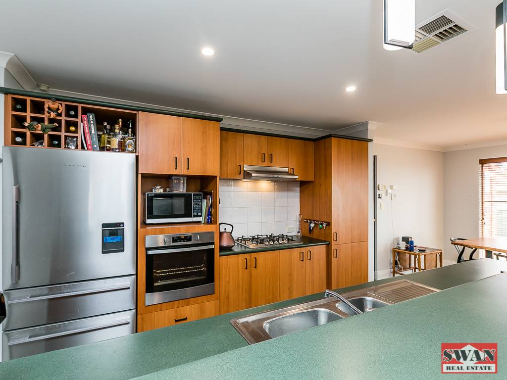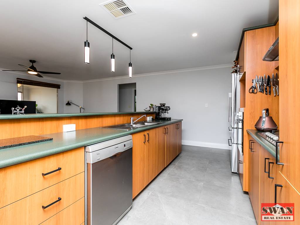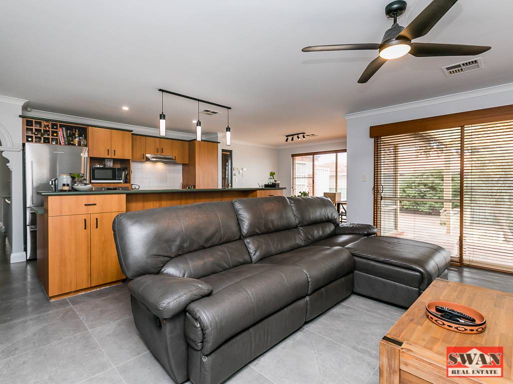 Beautifully tiled throughout with finishing touches such as ceiling fans and quality light fittings and fixtures throughout.  There is a double remote controlled garage with shoppers entry door to kitchen, a security alarm system and solar power.