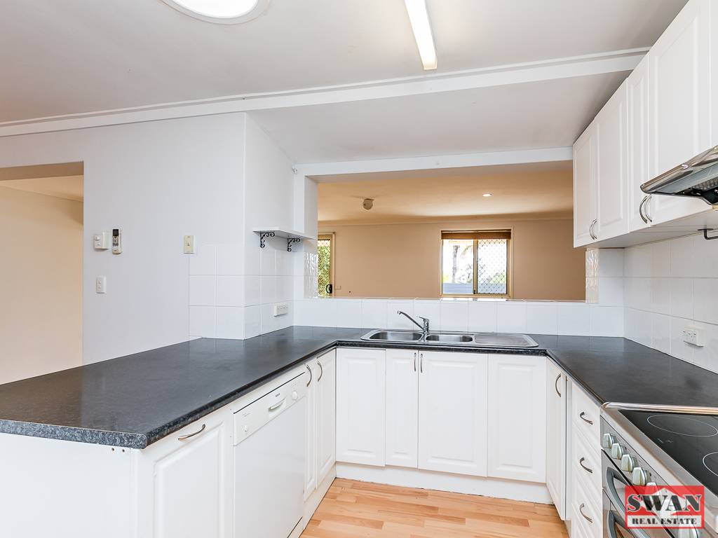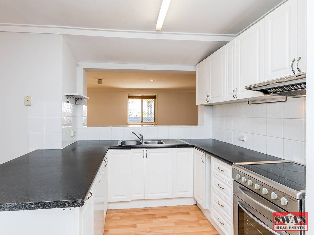 This U-shaped kitchen has plenty of bench and cupboard space, overhead rangehood and dishwasher.