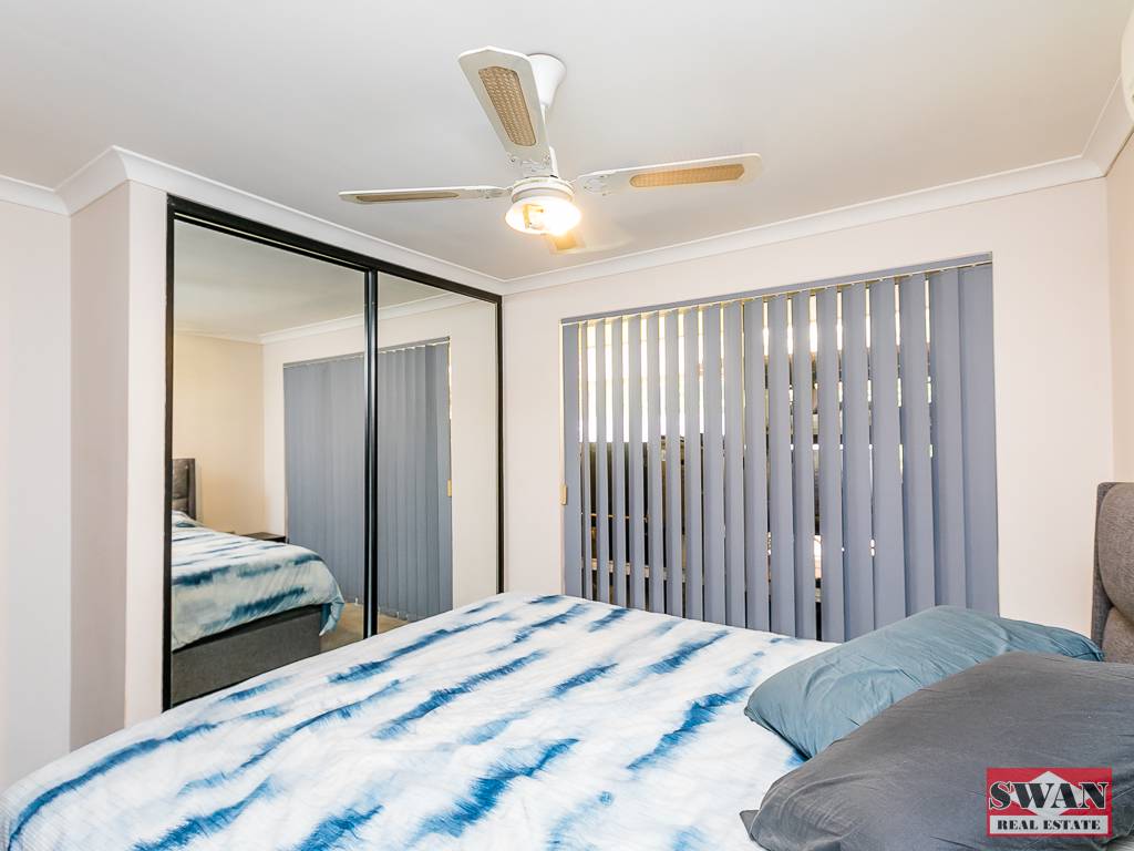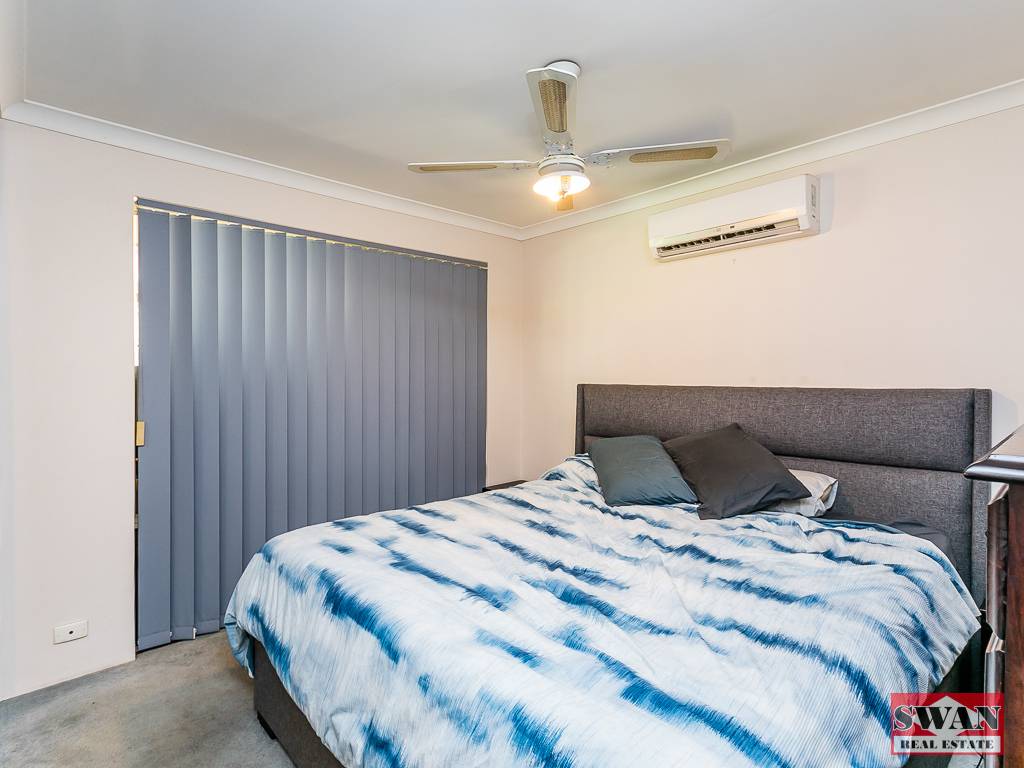 There are 3 bedrooms, with the master bedroom equipped with mirrored robes, a ceiling fan, as well as split system air con.
