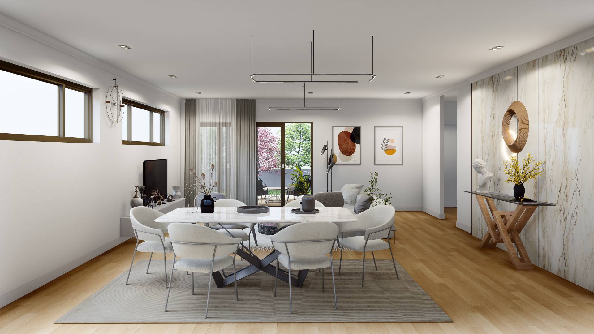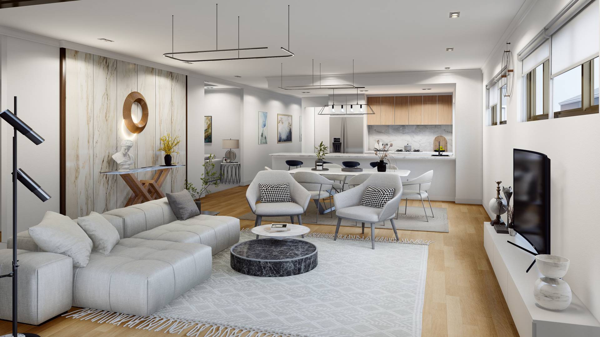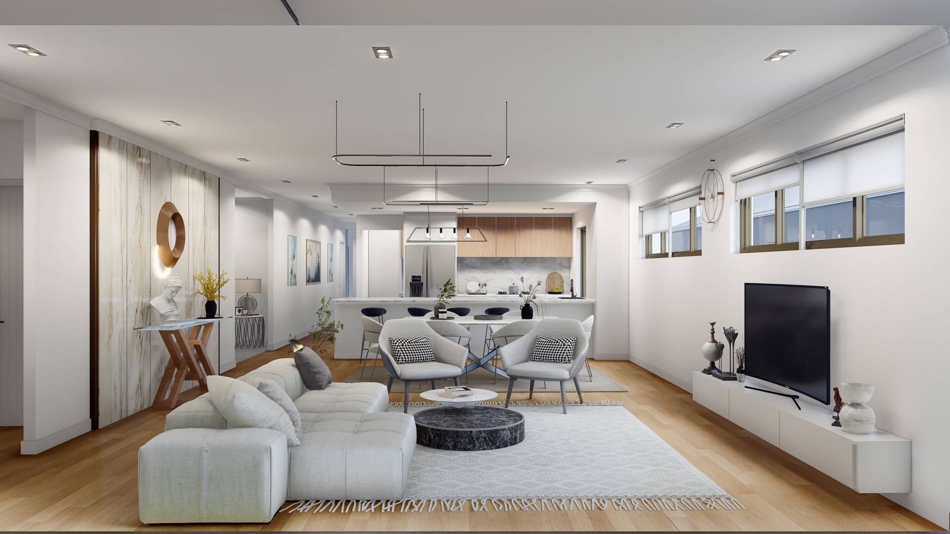 The open plan hub accommodating dining, family and luxurious kitchen also have a separate theatre/entertaining area.