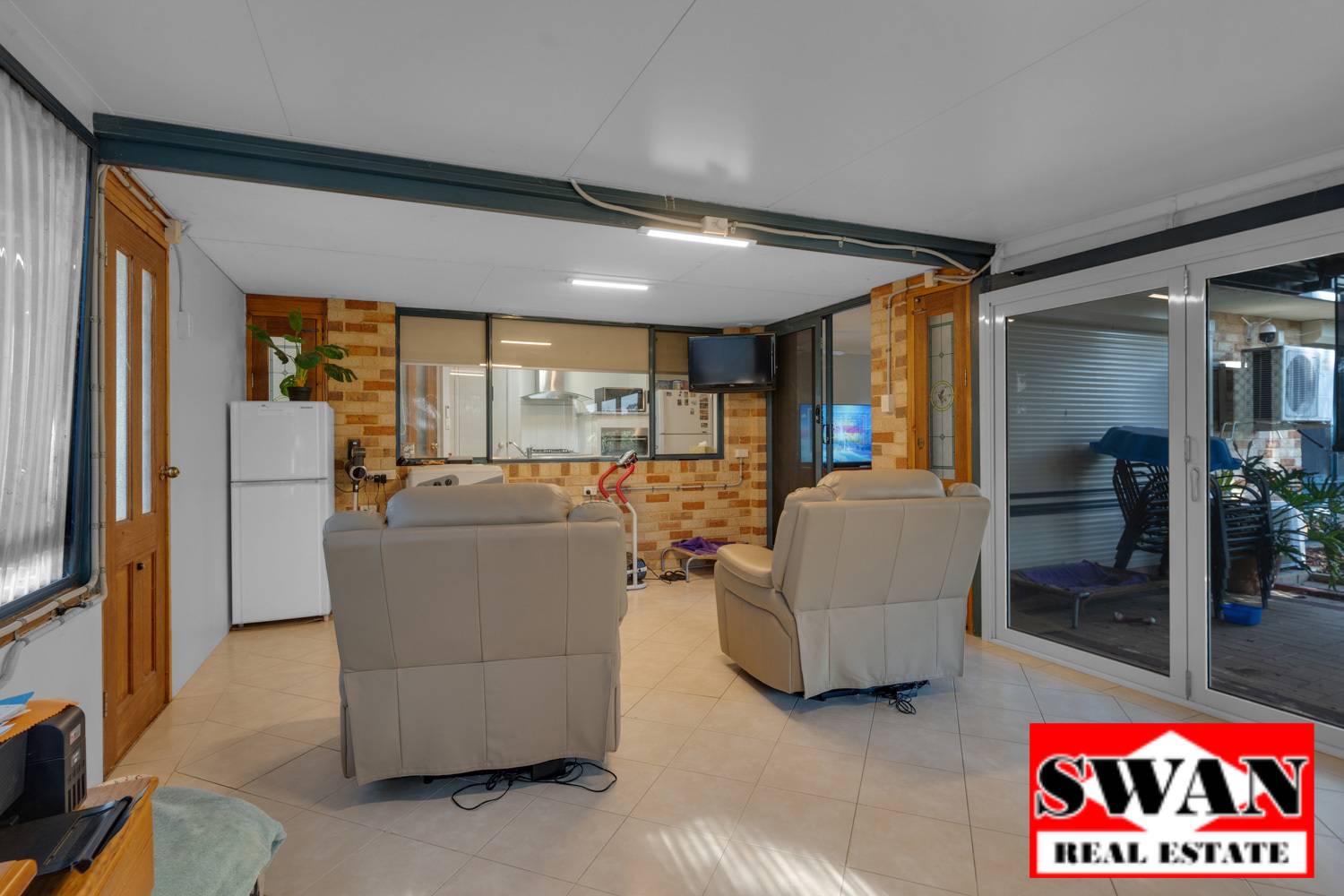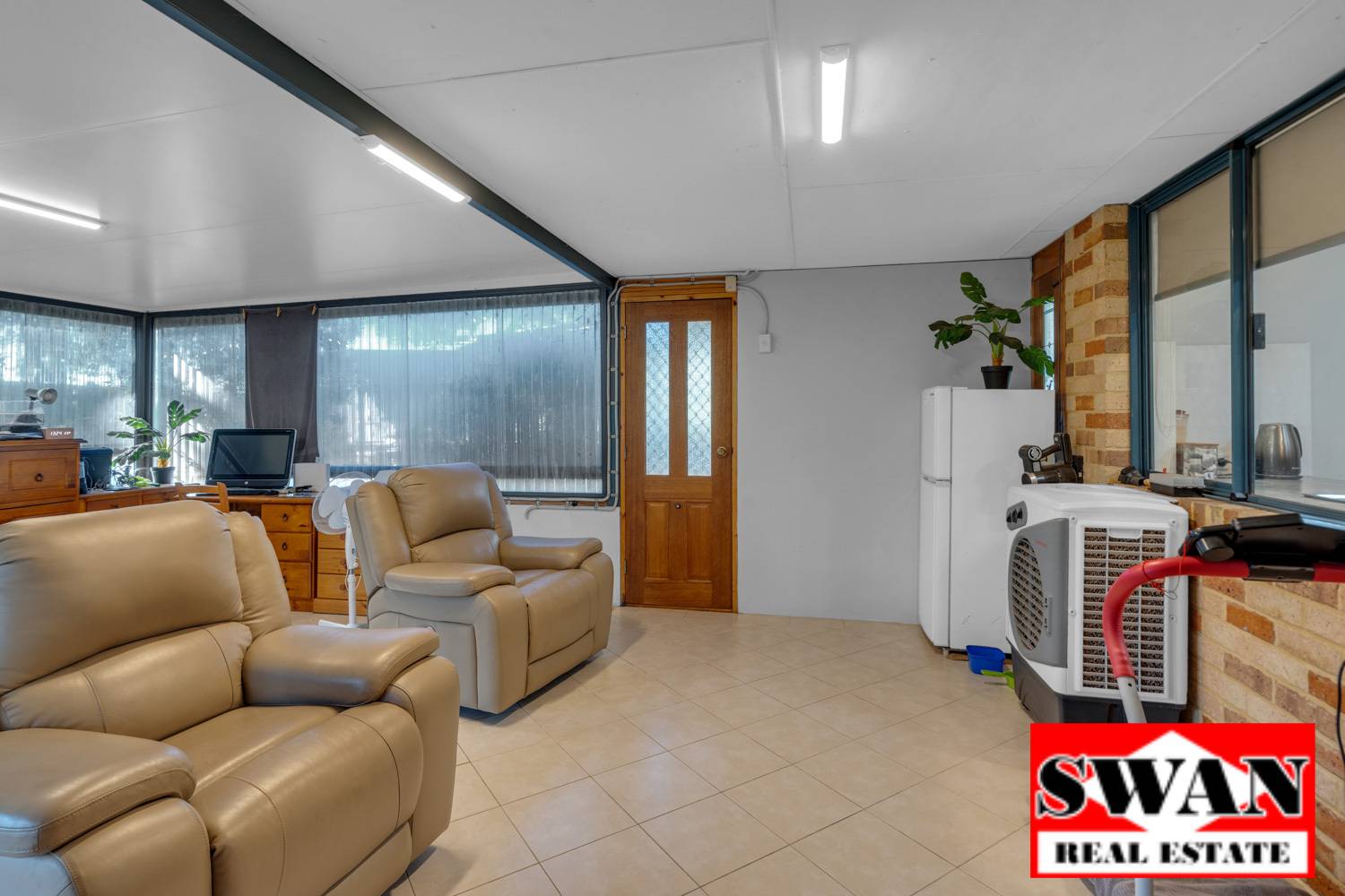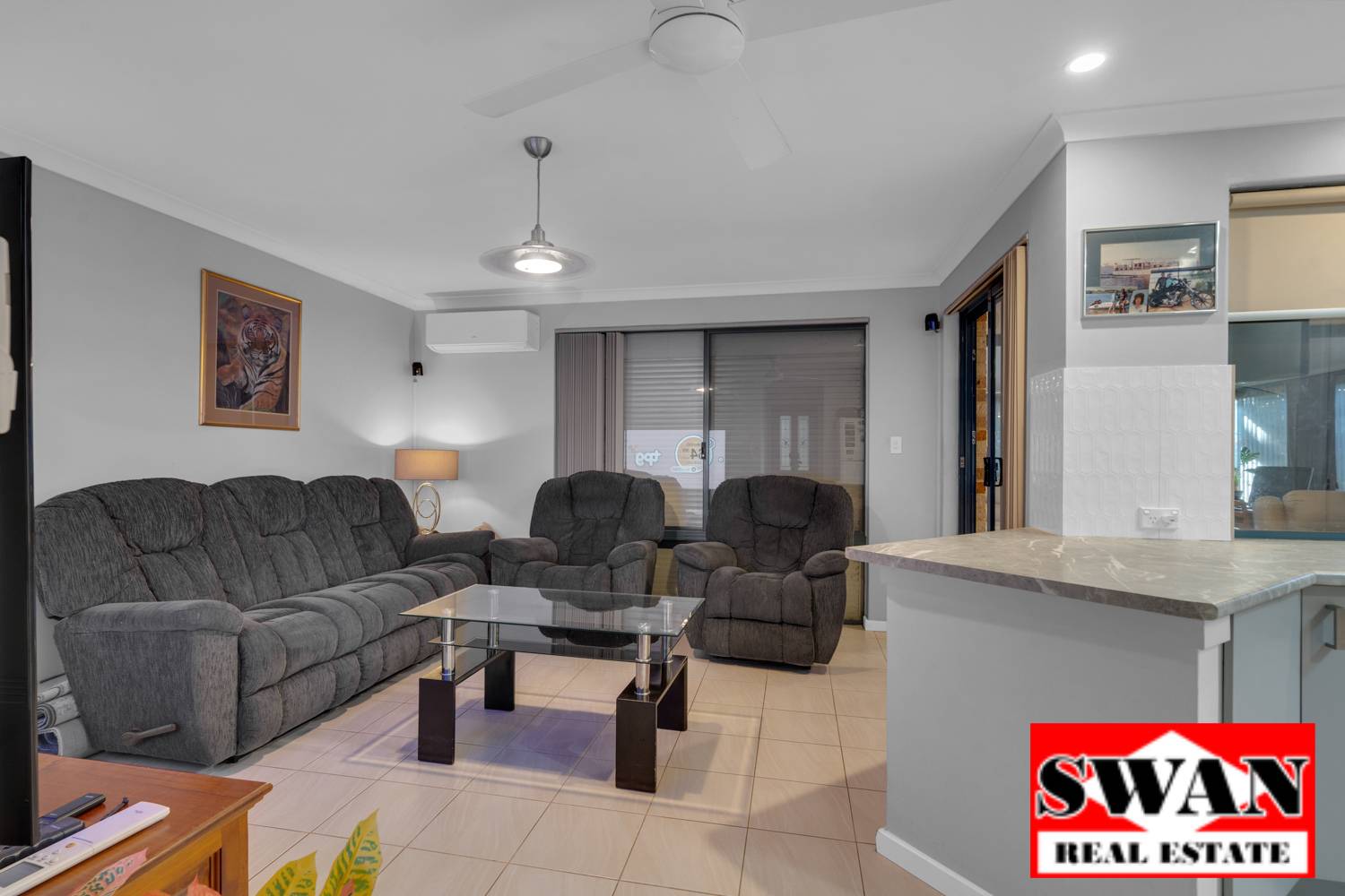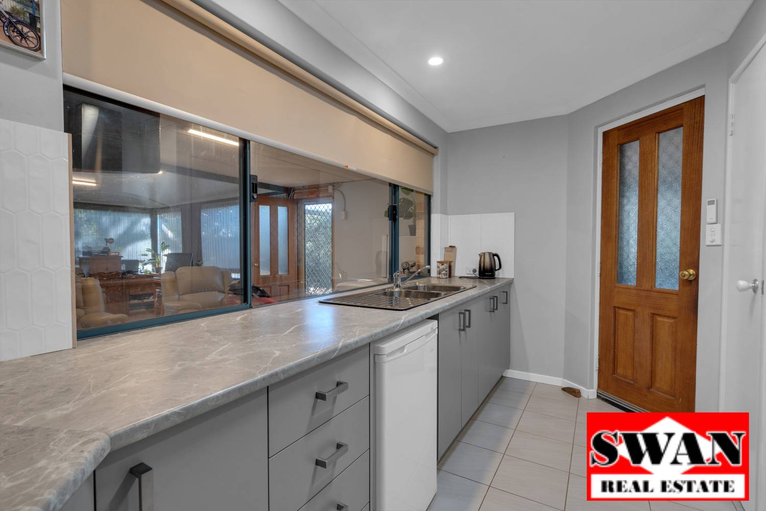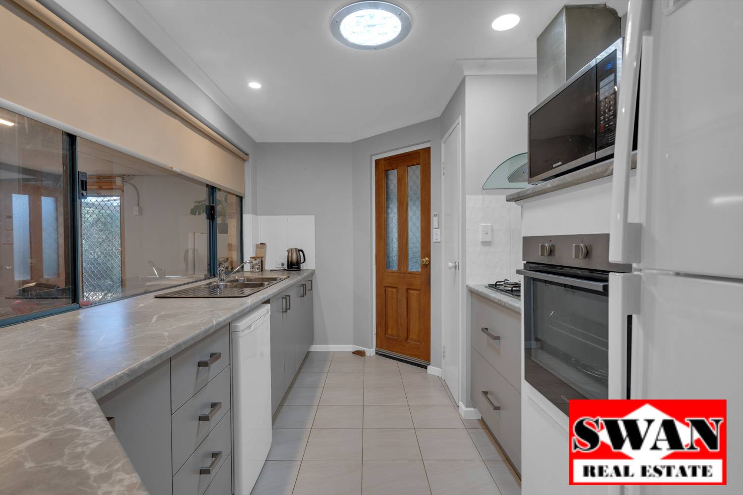 The kitchen features a stylish, modern look with lots of bench space, gas cooktop, shoppers entrance from the carport , double sink and is a very practical design. Note: The freezer drawer in the kitchen does not form part of the sale.