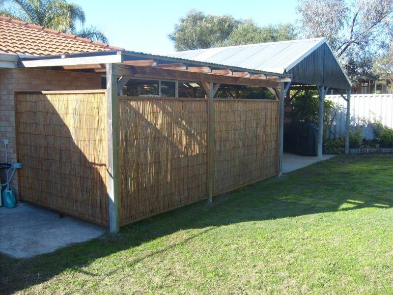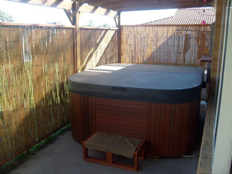 There is a garden shed but a large workshop could easily be erected and there is an area sectioned off which incorporates the spa and is surrounded by coconut matting.